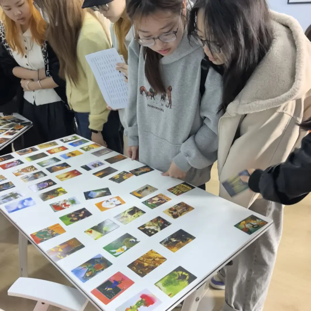活动伊始,吴老师带领大家开展香氛试纸猜味游戏,清甜与馥郁的香气交织,轻松打破陌生感。随后大家选取心理卡牌自我介绍,小组内轮流传阅活动卡互评,在纸笔间梳理自我特质,完成深度自我觉察。