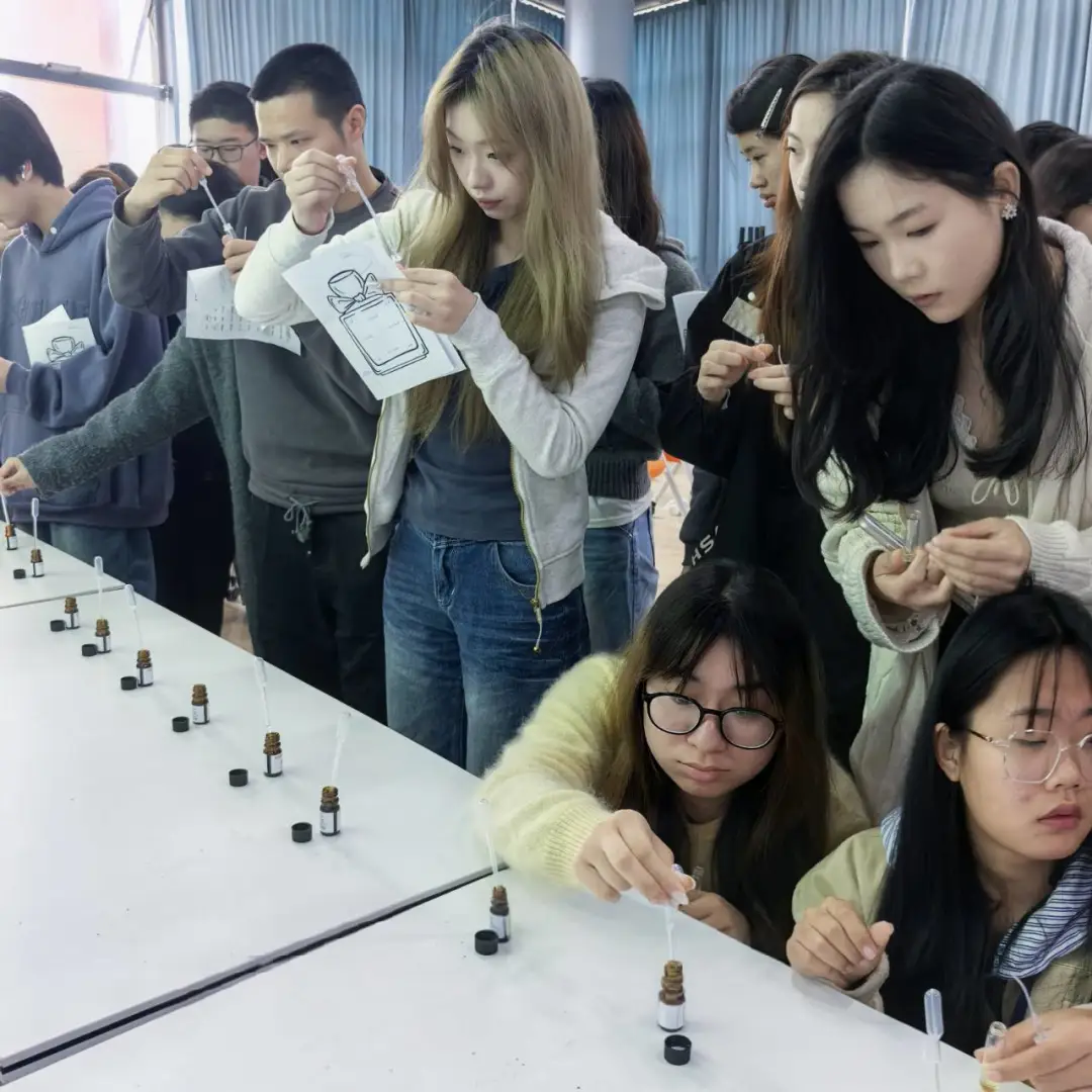 香氛DIY环节,同学们通过对乔哈里窗“开放我、盲目我、隐藏我、未知我”的探索,找到了属于自己的香水类型,化身调香师,在吴老师指导下学习前中后调搭配技巧,精心挑选精油、滴液摇匀,将自身性格特质融入瓶中,亲手调制出独一无二的专属香氛,收获满满成就感。
